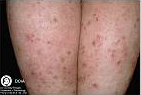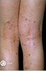 In den chronischen Phase fällt vor allem auf, daß die Haut durch das konstante Kratzen und Scheuern rauher und dicker wird, und die Hautlinien sich vergröbern, was vom Arzt als Lichenifikation bezeichnet wird.