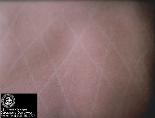 "Dermographismus" (derma=Haut, graphein=zeichnen) bedeutet wörtlich "Hautzeichnung". Dieses Stigma wurde erstmals 1858 von Marey beschrieben. Während festes Streichen mit der Spitze eines Gegenstandes (wie einer Büroklammer, das obere Ende eines Bleistifts oder eines Kugelschreibers) bei gesunder Haut eine streifenförmige Rötung hervorbringt, entsteht auf atopischer Haut ein weißer Streifen. Dieser weiße Streifen ersetzt beim Atopiker die anfänglich rote Linie nach etwa 15-60 Sekunden.