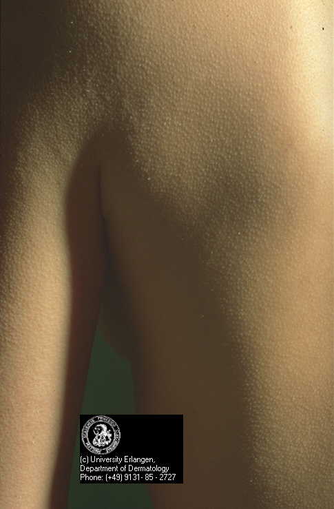 Sog. Hühnerhaut: Follikelkeratosen, d.h. eine verstärkte Verhornung und Schuppung an den Haarbälgchen der Haut