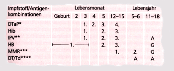 Impfempfehlungen der Ständigen Impfkommission am Robert Koch Institut (STIKO), Stand März 1998 - Empfohlenes Impfalter und Mindestabstände zwischen den Impfungen.Um die Zahl der Injektionen möglichst gering zu halten, sollten vorzugsweise Kombinationsimpfstoffe verwendet werden. Impfstoffe mit unter-schiedlichen Antigenkombinationen von D/d, T, aP, HB, Hib, IPV sind bereits verfügbar oder in Vorbereitung.